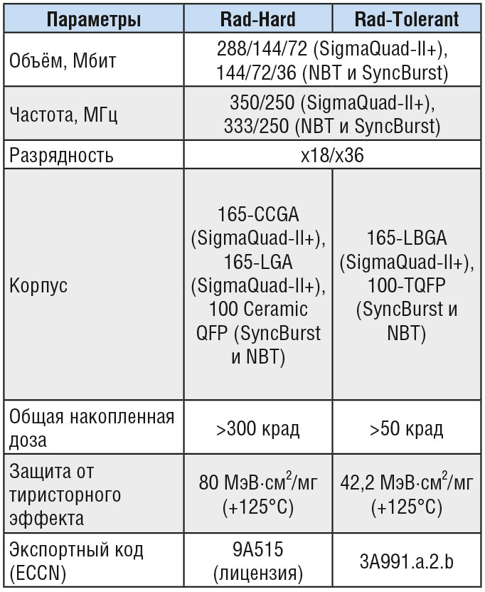 C 2019 года компания начала выпуск радиационно стойких микросхем NBT, SyncBurst и SigmaQuad-II+ в двух исполнениях: Rad-Hard и Rad-Tolerant. Функционально микросхемы этих исполнений являются полными аналогами. Микросхемы Rad-Hard выпускаются в керамических корпусах, что в конечном итоге приводит к более высокой степени надёжности и вместе с тем – к необходимости получения экспортных лицензий. На микросхемы Rad-Tolerant лицензии или другие документы, ограничивающие их применения, не требуются. Основные характеристики радиационно стойких микросхем приведены в таблице 8.