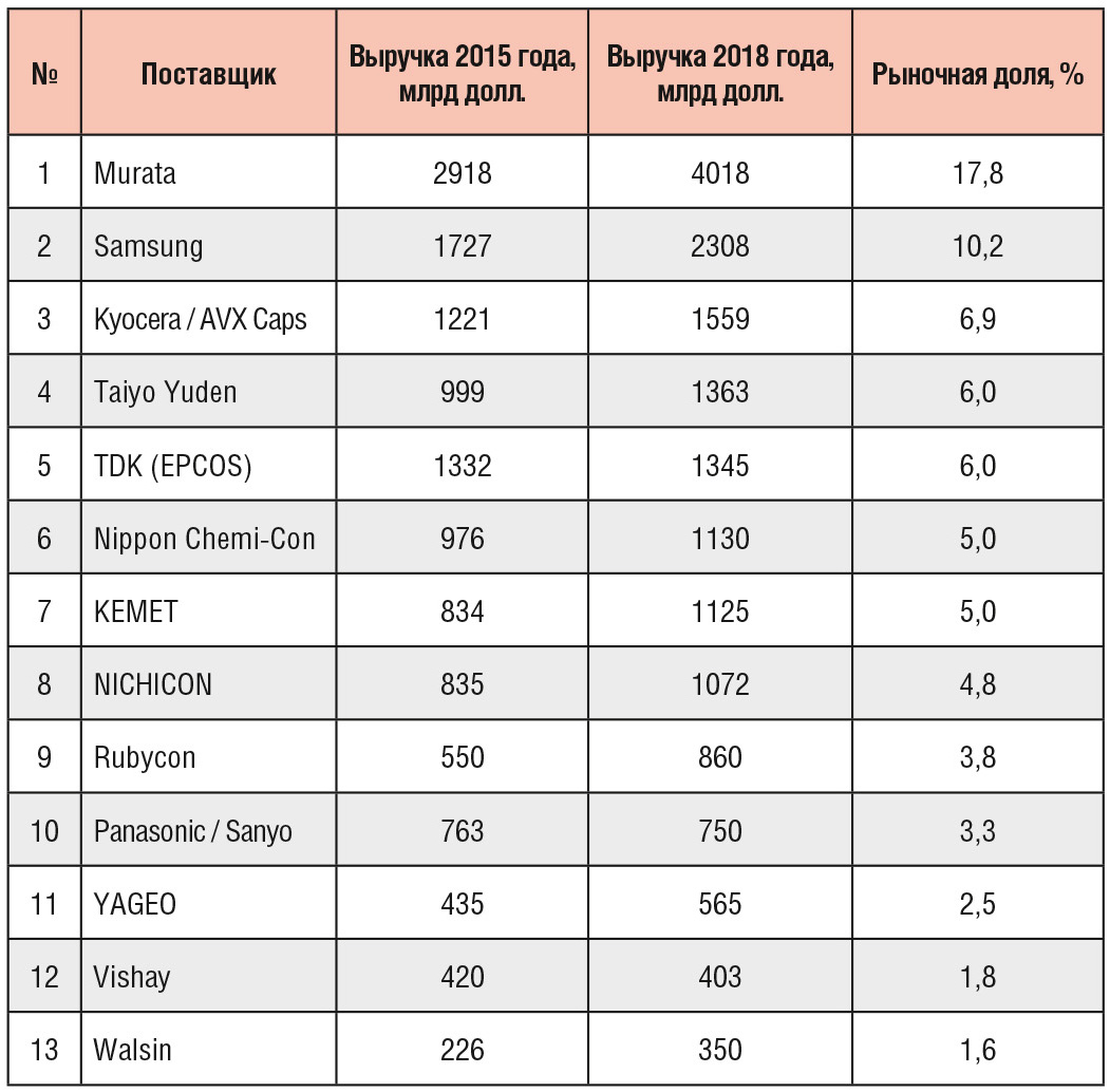Согласно данным компании Gartner, в её исследованиях глобального рынка полупроводниковой продукции итоги падения в 2019 году составили 11,6% от уровня 2018 года. По данным Paumanok Publications, мировые продажи конденсаторов в 2019 году составили $19 млрд, или 15,9% от уровня 2018 года. Для получения цифры продаж в 2019 году по брендам и по типу автор использовал коэффициент 0,85 от уровня 2018 года.