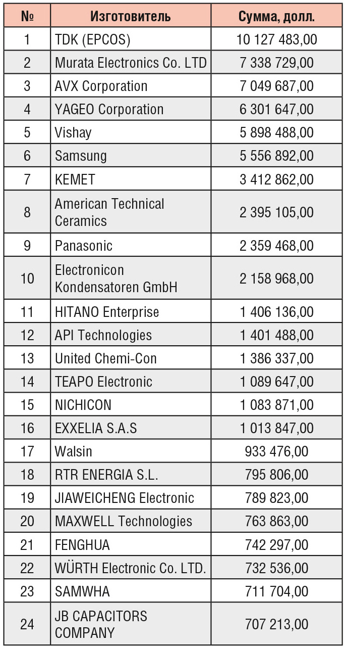 Автор счёл необходимым несколько скорректировать эти данные, например, были удалены бренды Toyota и Skoda с описанием «для производства автомобилей», были также исключены ABB Automation, ООО «Самсунг Электроникс Рус Калуга», LG Electronics и ООО «ЛГ Электроникс Рус» – компании, конденсаторы которых идут на собственное производство. В сумме все эти вычеты значительны и составляют $9 млн. По убеждению автора, эти поставки де-факто российские, но де-юре – нет. Кроме того, у участников российского рынка нет никаких шансов поставлять данные конденсаторы этим предприятиям напрямую в России. Если вычесть цифры вышеуказанных предприятий, то остаются $89,5 млн.