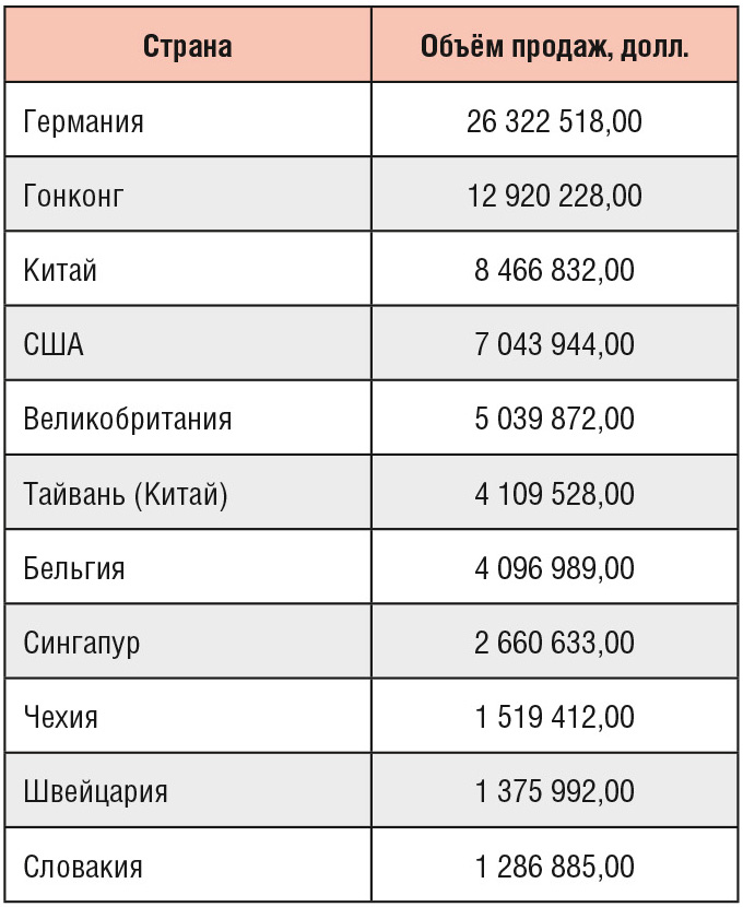 Следующие две таблицы показывают страну, где был продан товар (см. табл. 6) и объёмы импорта от первых двух поставщиков в этой стране (см. табл. 7).