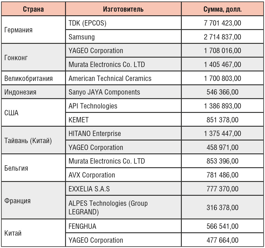 Импорт по производителям представлен в таблице 3. В таблице объединены бренды TDK и EPCOS, а компания ATC, производитель высоконадёжных конденсаторов, резисторов, индуктивностей, является дочерним предприятием AVX, которая, в свою очередь, является дочерней компанией японского гиганта Kyocera, представлена отдельно.