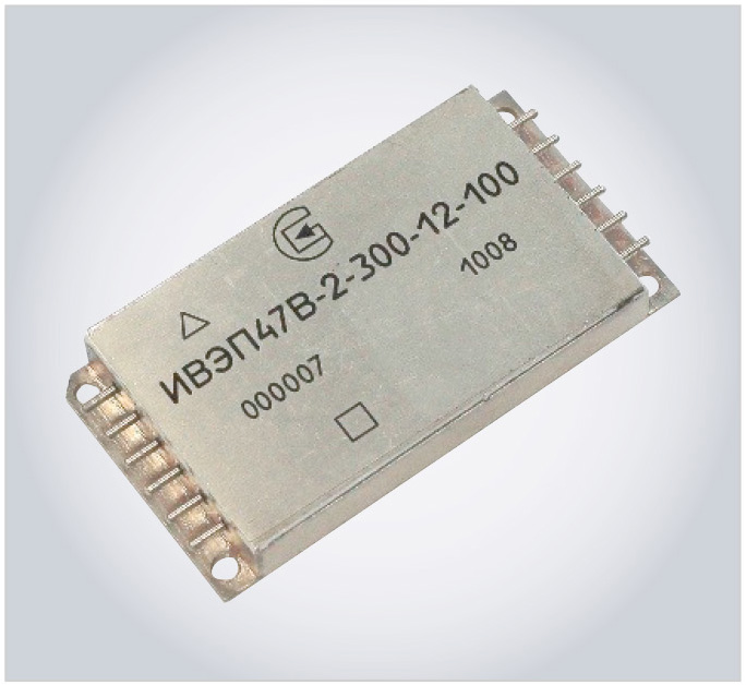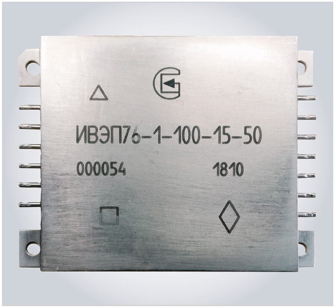 Работа по этому проекту проводилась с целью импортозамещения ряда модулей второго поколения фирмы Vicor мощностью 50, 100 и 200 Вт с выходными напряжениями от 3,3 до 48 В. В ходе проведённой работы разработан и запущен в производство ряд модулей источников вторичного электропитания серии ИВЭП76 (21 типономинал). Модули ИВЭП76 (см. рис. 5) выполнены в металлостеклянных корпусах с планарным расположением выводов по гибридно-плёночной технологии с применением бескорпусной элементной базы категории качества «ВП».
