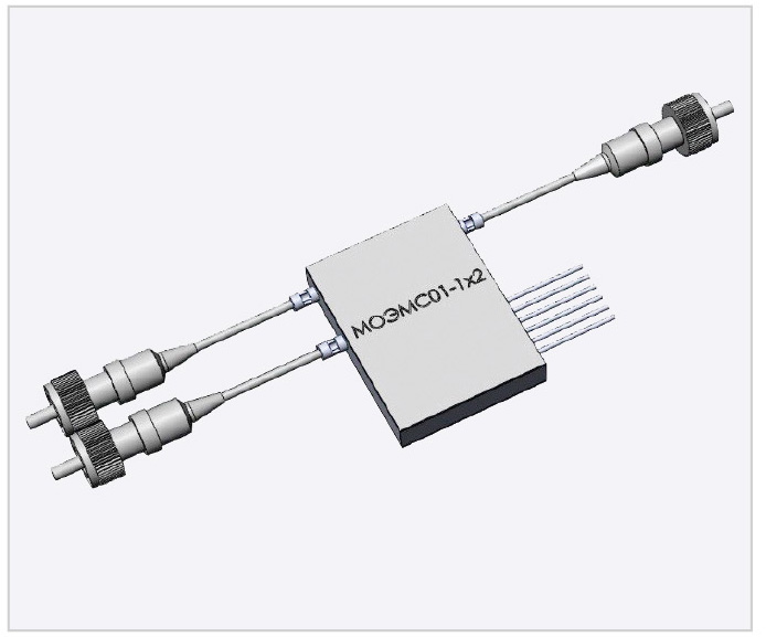Назначение изделия: коммутации оптического излучения с длиной волны 1310 и 1550 нм в волоконно-оптических системах передачи. Система микрооптоэлектромеханической коммутации и модуляции оптического излучения МОЭМС01-1х2 ЛУЮИ.468379.001 ТУ конструктивно представляет собой МЭМС-кристалл, способный без двойного преобразования переключать оптический сигнал из одного оптического выхода во второй, и микросхему управления МЭМС-кристаллом, которые расположены в герметичном металлостеклянном корпусе.