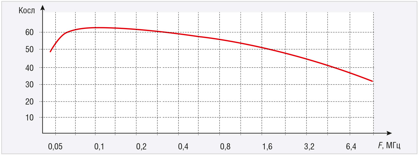 Рассмотрим подробнее особенности ОВН как устройства помехоподавления. В установившемся режиме работы ОВН серии МДН представляет собой, по существу, фильтр, управление включением которого может осуществляться по выводу ВКЛ маломощным ключом (маломощным транзистором, контактами реле, выходом цифровой ИМС). Сглаженная частотная характеристика коэффициента ослабления КОСЛ ОВН серии МДН с максимальным выходным током 5 А показана на рисунке 3.