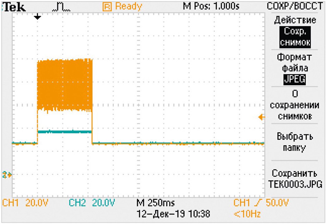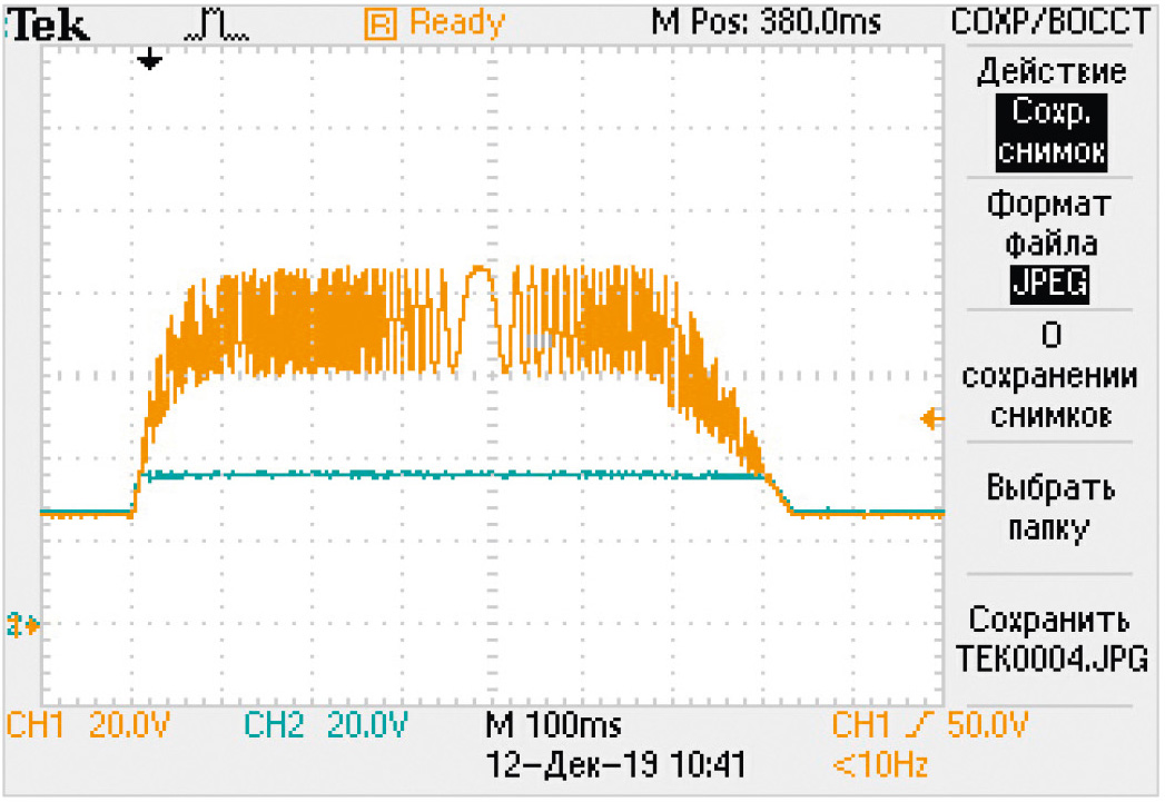 Амплитудное значение выброса входного напряжения достигает 51 В, длительность переходного процесса около 2 с. Нарастание и спад напряжения сопровождаются высокочастотными коммутационными помехами. Однако ОВН эффективно сглаживает их, фиксируя выходное напряжение на уровне около 37 В.