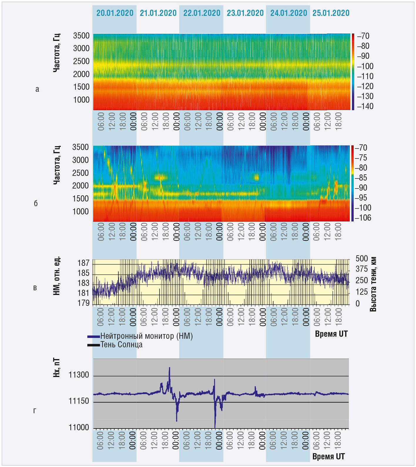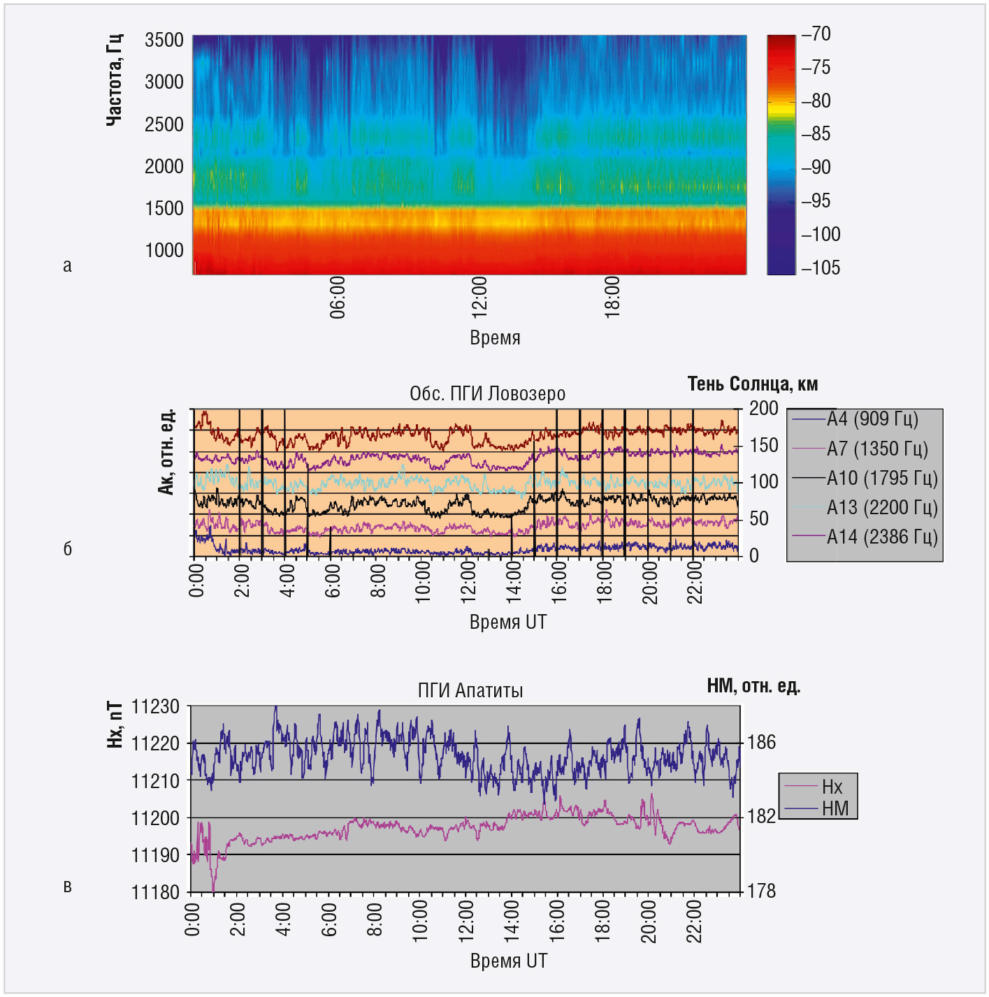 На рисунке 3 представлены суточные характеристики (24.01.2020, обс. ПГИ Ловозеро) ПА (см. рис. 3а), наборы нормированных амплитудновременных характеристик Ак узкополосных каналов (см. рис. 3б), вариации нейтронного монитора и магнитограмма поля Земли (см. рис. 3в).