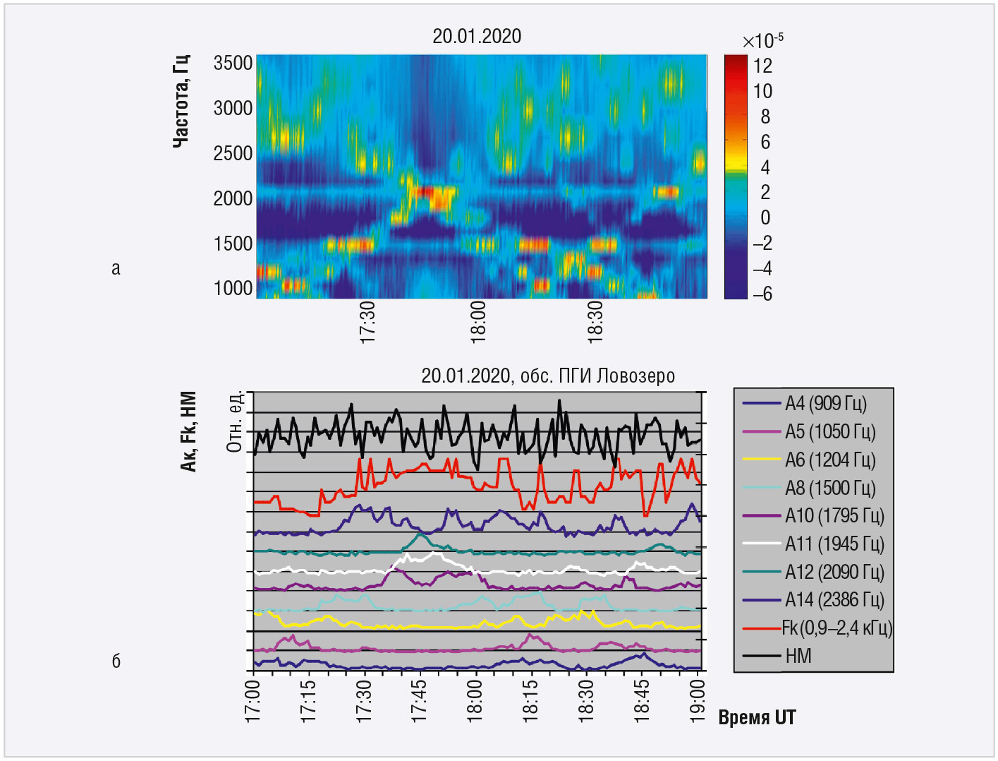 На рисунке 2 представлен двухчасовой (17:00–19:00, 20.01.2020) фрагмент сонограммы спектра ПА без учёта поверхностной волны (см. рис. 2а), набора нормированных огибающих Ак (номер канала АСПА) узкополосных фильтров анализатора (см. рис. 2б). Временное разрешение АСПА (1 мин) позволяет получать значение критической частоты Fкр синхронно с показаниями НМ.