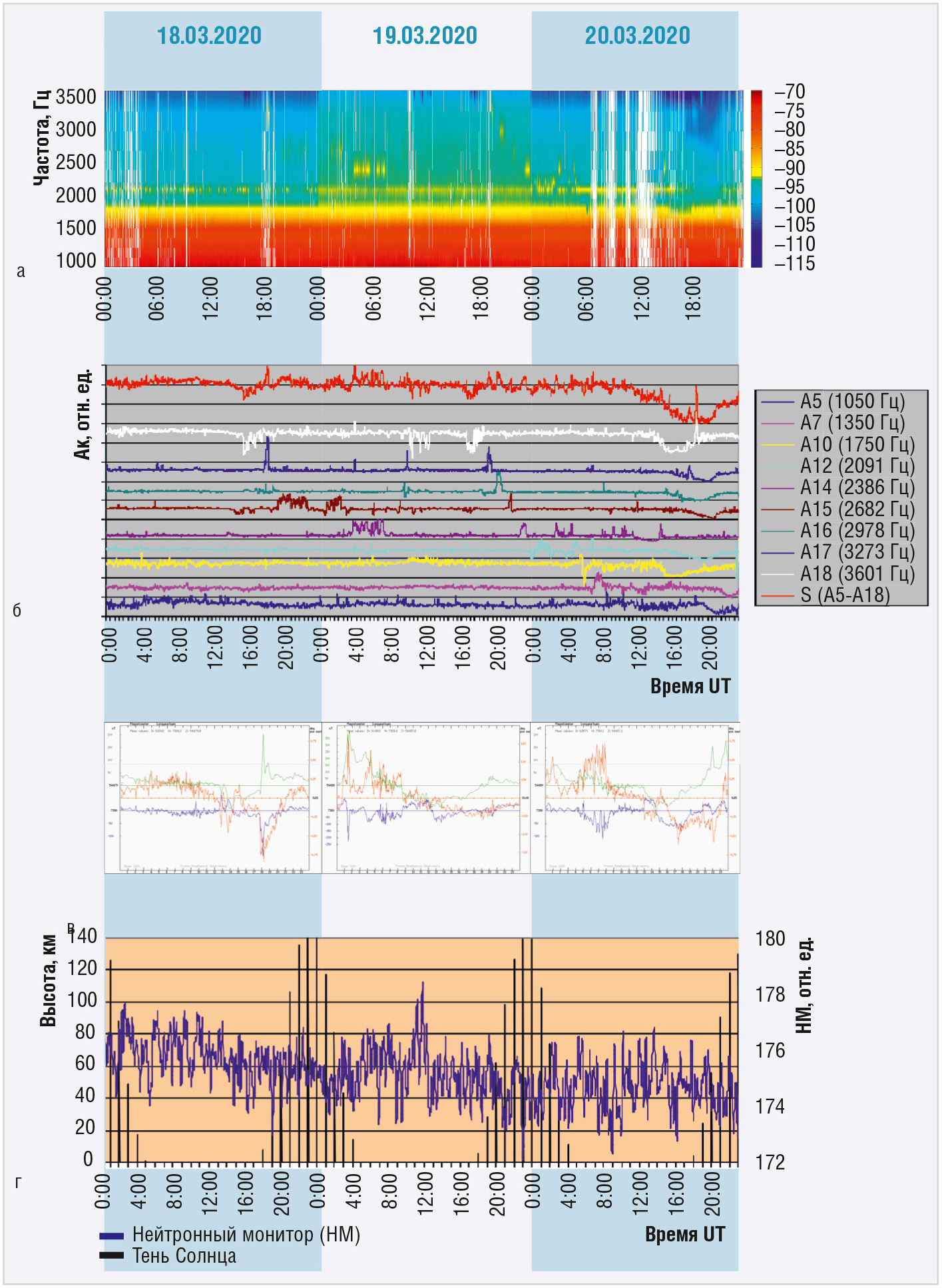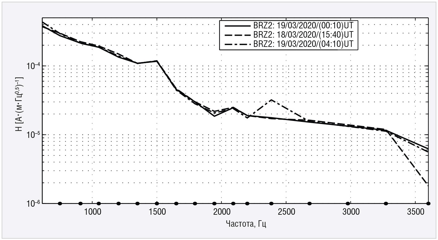 В связи с тем что авроральные обсерватории ПГИ имеют разное географическое местоположение, и физикохимические процессы, протекающие в околоземном пространстве, имеют разную степень солнечноземных связей, то вполне очевидно, что АЧХ ПА отличаются. На рисунке 5 представлен пример трёхдневной (18.03–20.03.2020) синхронной записи спектров ПА, НМ [4] и магнитного поля Земли [6].