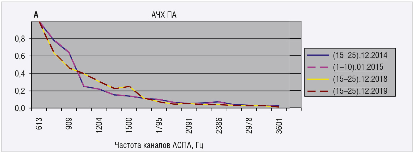 На рисунке 7 представлены усреднённые за 10 суток АЧХ ПА за временной промежуток декабрь–январь 2014–2019 года, где заметны изменения характеристик за четырёхлетний период.