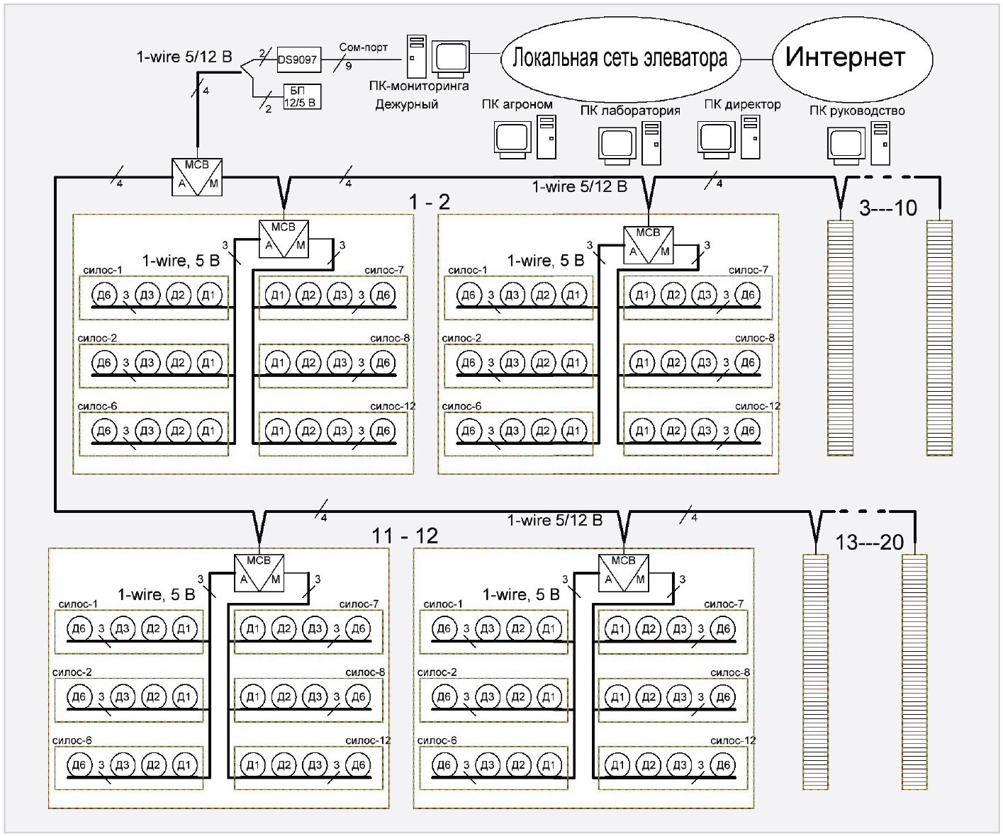 Структурная схема термометрии силосов элеваторов с использованием интерфейса 1-wire фирмы Dallas Semicondutor представлена на рисунке 1. Предлагаемая система сигнализации и диагностики разработана под конкретную сельскохозяйственную задачу – термометрию хранения зерна вертикального зернохранения.