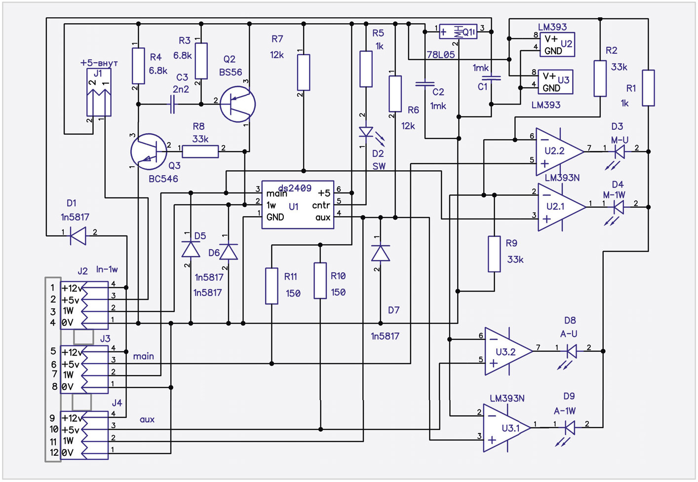 Схема содержит узел переключения на микросхеме U1 (DS2409), используемый в ветвителе МL-09 [2], что позволяет сохранить совместимость программного обеспечения и применить все ранее созданные программы и программы любого производителя стандарта 1-wire. Модернизированная составляющая схемы состоит из схемы регенерации сигнала и схемы сигнализации замыкания.