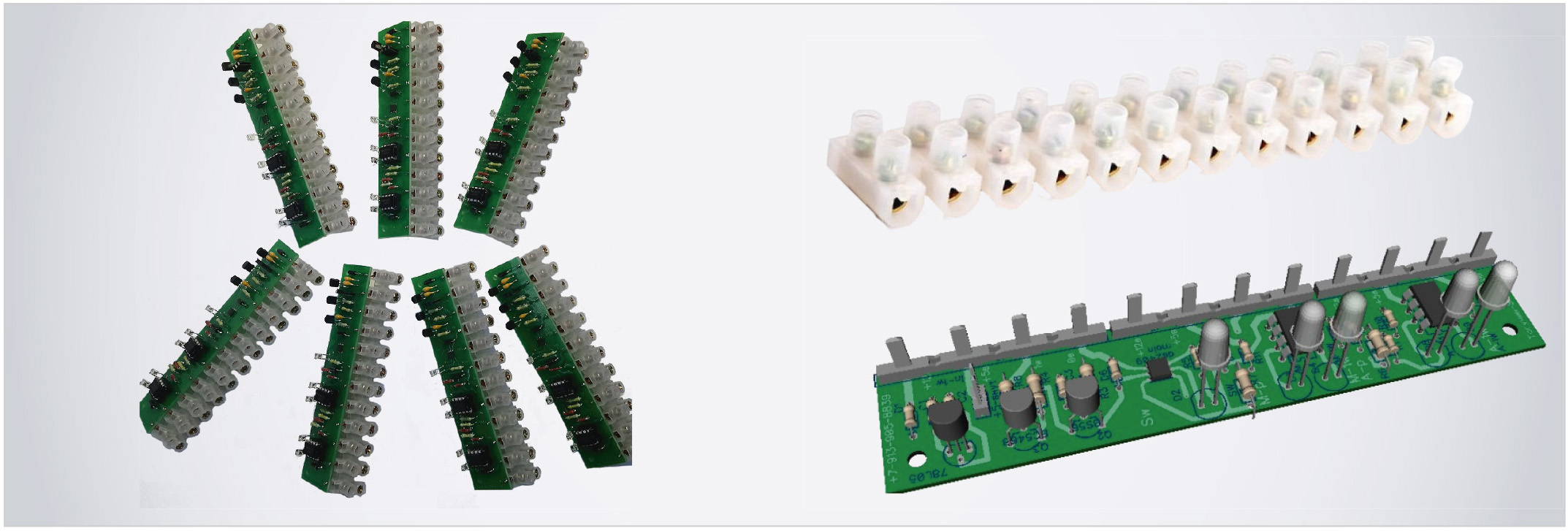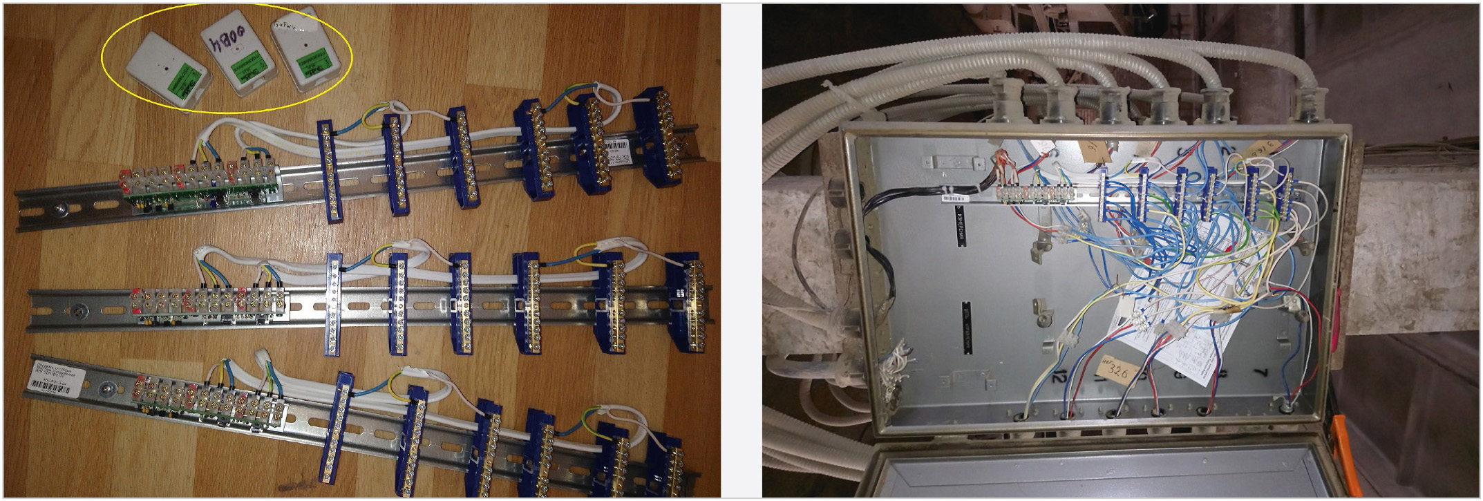 На рисунке 4 слева показана фотография трёх плат МСВ с подключением по шесть DIN-колодок на трёх DIN-рейках и справа – плата МСВ на одной DIN-рейке, установленная в шкаф термометрии с проведённым монтажом линий силосов. На левом фото для сравнения выделены белые корпуса ранее использовавшихся ветвтвителей МЛ-09 [2, 3].