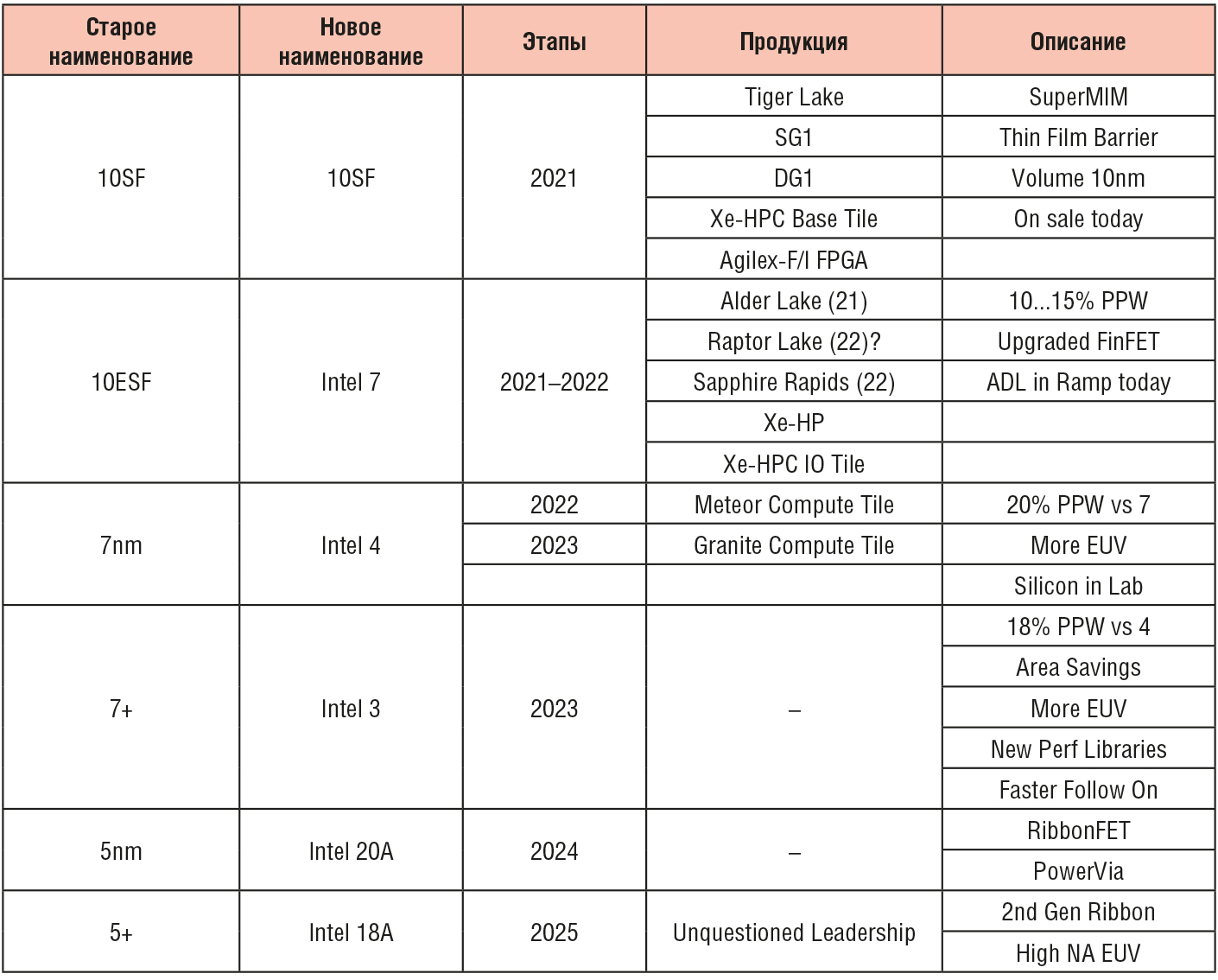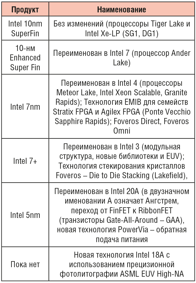 Со II квартала 2022 года начнётся производство процессоров Meteor Compute Tile и Granite Compute Tile с технологией 7-нм. На 2024 и 2025 годы намечено производство микрочипов по технологии 5-нм. Следует обратить внимание на то, что в дорожной карте Intel вводятся новые наименования (табл. 11).