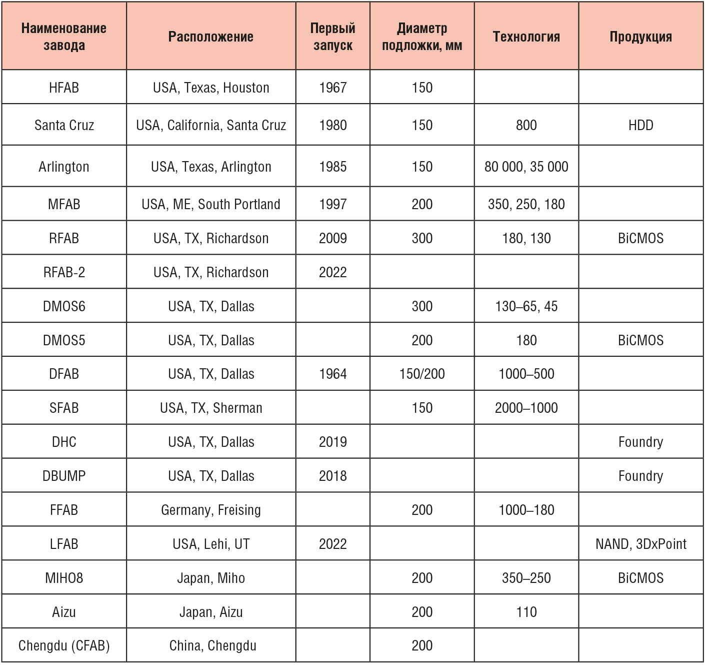 Новые фабрики дополнят существующие 300-мм фабрики TI, в том числе DMOS6 (Даллас, Техас), RFAB1 и RFAB2 в Ричардсоне, строительство которых будет завершено в 2022 г. Кроме того, ожидается, что завод LFAB (Лехи, Юта), который TI недавно приобрёл у Micron, начнёт производство в начале 2023 г.