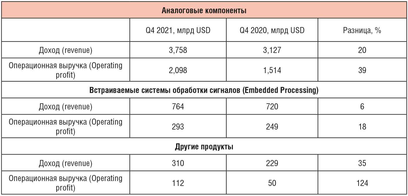 В табл. 13 приведены результаты доходов TI за IV квартал 2021 и 2020 годов (Q4 2021 и Q4 2020), соответственно.