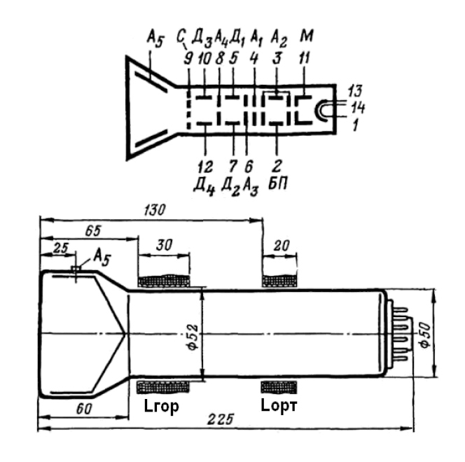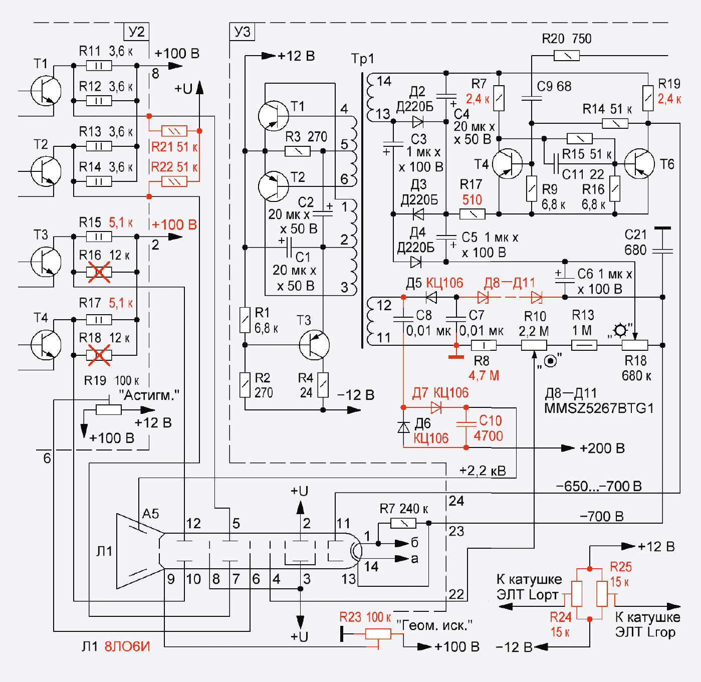 8ЛО6И допускает интервал на отклоняющих и бланкирующих пластинах, 3-м и 4-м анодах относительно 2-го анода только в пределах –50…+50 В. Кроме того, относительно 2-го анода требуется отрицательное напряжение на катоде в пределах –600…–900 В и положительное на 5-м аноде – +2…3 кВ. Как мы видим, напряжения на электродах у этих ЭЛТ существенно отличаются, в том числе полярностью.