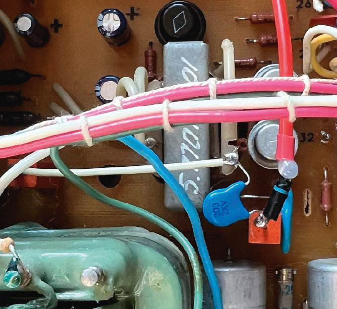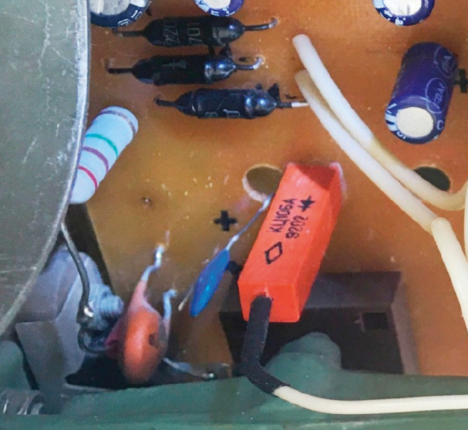 - Громоздкий штатный блок ВВ-выпрямителя с платы У3 удалён и заменён выпрямителем на менее габаритных ВВ-диодах и дисковых конденсаторах. На плате со стороны проводников связь вывода конденсатора С7 с контактной площадкой «к–Д5» разорвана. На площадке «к–Д5» распаяны вывод анода Д5 и вывод С7 (рис. 2).