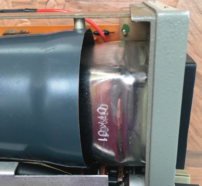 Для крепления штатным хомутом задней части баллона ЭЛТ на панельку трубы натянута и приклеена «Моментом» уплотнительная резиновая шайба внешним диаметром 55…56 мм толщиной 3 мм. Можно купить в магазинах хозтоваров и сантехники. - После установки на бленду прозрачного защитного стекла стали видны края окна передней фальшпанели, поэтому они были закрашены в чёрный цвет. Чтобы стеклянная плоскость экрана ЭЛТ Л1 примыкала к фальшпанели, круглое отверстие передней панели каркаса чуть расточено надфилем под продольные углы колбы ЭЛТ. После юстировки колба по продольным углам зафиксирована в отверстии панели четырьмя каплями автомобильного герметика.