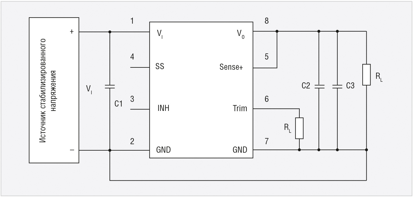 В том случае, когда нет необходимости в использовании функции управления включением/выключением модуля, вывод INH оставляют «плавающим» или подключают к шине входного напряжения через резистор с номинальным значением 10…100 кOм. Необходимо отметить, что значение напряжения на выводе INH не должно превышать 5,5 В.