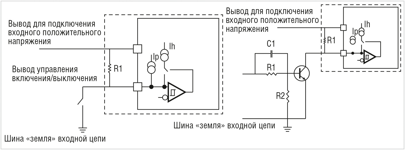 Резисторы R1 и R2 делят входное напряжение так, чтобы напряжение на выводе INH находилось в приемлемом диапазоне. Сопротивление R2 должно быть рассчитано и выбрано в сочетании с наивысшим и наименьшим входным напряжением. Сопротивление R2 не должно быть слишком маленьким. Когда входное напряжение имеет наименьшее значение, необходимо удостовериться, что напряжение на выводе INH после деления напряжения имеет значение не менее чем 1,18 В. Когда входное напряжение имеет наивысшее значение, необходимо убедиться, что напряжение на выводе INH после деления напряжения не выше чем 5,5 В. Рекомендуется выбирать резистор R2 с номинальным значением 39 кОм. Когда входное напряжение имеет значение 4,5 В, уровень напряжения на выводе INH около 1,26 В; когда входное напряжение 6 В, напряжение на выводе INH будет примерно 1,68 В.