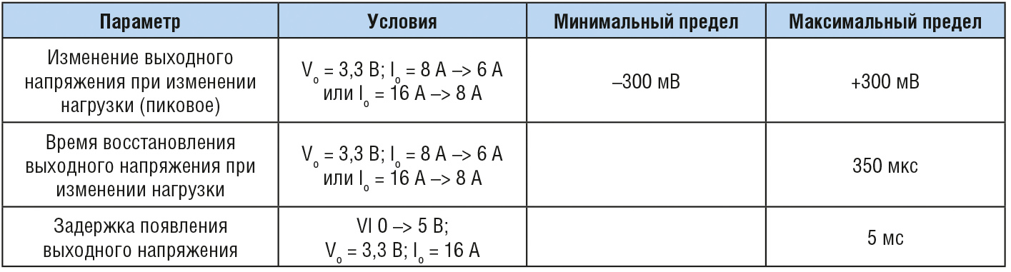В табл. 3 и 4 приведены динамические характеристики модулей преобразователей напряжения HNFA0516SS и HNTA0510SS. Размах изменения нагрузки задан в диапазоне 50%.