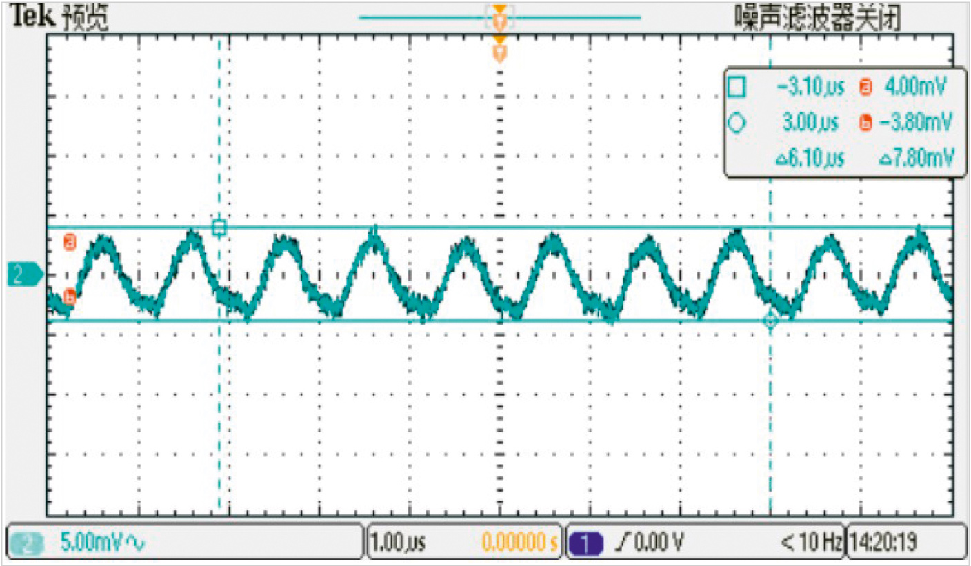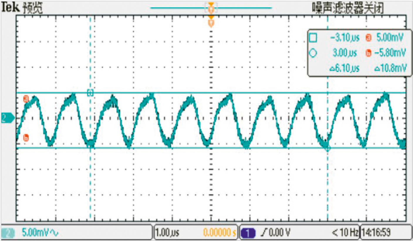 При установленных на выходе дополнительных танталовых конденсаторах 330 мкФ и двух керамических конденсаторах 1 мкФ пульсация выходного напряжения составляет 7,8 мВ при выходном напряжении 1 В и токе нагрузки 8A, и 10,8 мВ при токе нагрузки 16 А и комнатной температуре. На рис. 5 и 6 показаны пульсации выходного напряжения преобразователя HNFA0516SS при разных токах нагрузки.