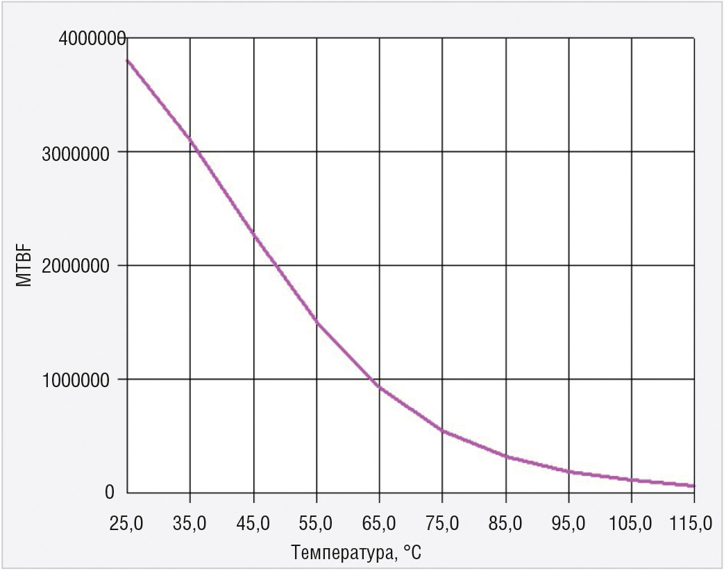 Обеспечение оптимального теплового режима позволяет достичь приемлемого срока функционирования устройства, так как повышенная температура увеличивает интенсивность отказов компонентов. Интенсивность отказов удваивается с увеличением температуры на каждые +15°C. Зависимость среднего времени наработки до отказа от температуры для преобразователя напряжения HNFA0516SS представлена на рис. 10.