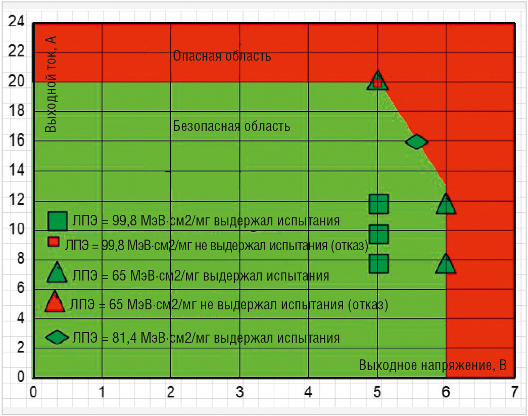 График безопасной работы преобразователей при воздействии одиночных заряженных частиц для различных выходных напряжений и токов представлен на рис. 11.
