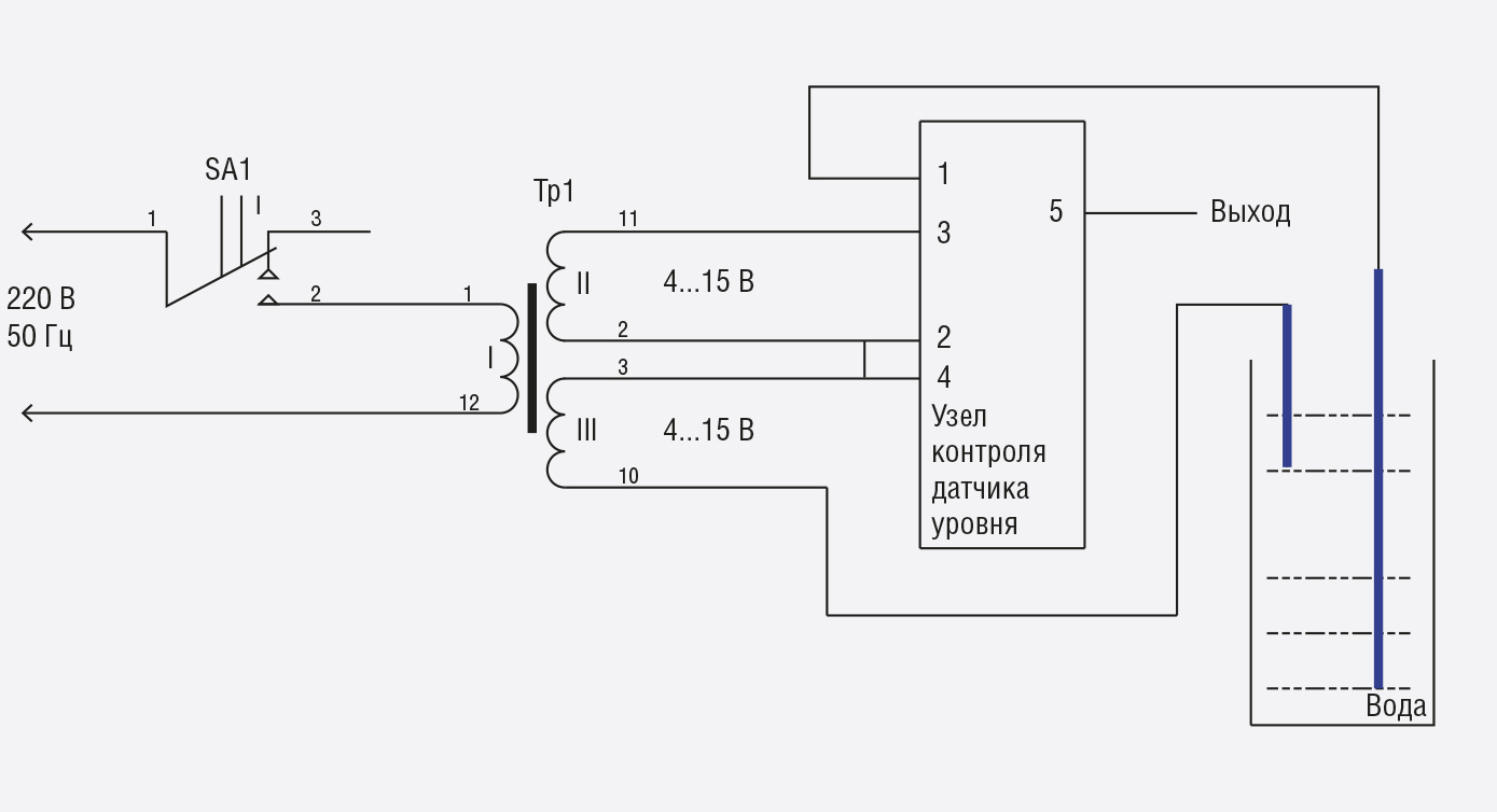 Для всех измерительных электродов, подключённых к контакту 1, используется общий электрод, подключённый к контакту 10 обмотки III трансформатора и находящийся в нижней точке контролируемой жидкости. Таким образом, в контролируемой по уровню жидкости устанавливаются несколько электродов на разных фиксируемых уровнях в общем объёме жидкости для измерения его уровня. Каждый контролируемый уровень, определяемый установленным измерительным электродом, требует применения отдельного узла контроля. Всё устройство контроля состоит из нескольких одинаковых узлов контроля уровня жидкости. При этом питание переменным током для всех устройств контроля осуществляется от общего маломощного источника. При отсутствии возможности использования переменного напряжения для питания узлов контроля возможно применение различных преобразователей с частотой не ниже 50 Гц с двухполярным напряжением +/- 12 В и средней точкой. Общей точкой выходных сигналов контроля уровня жидкости является контакт 2 узла контроля датчика уровня жидкости (см. рис. 2).