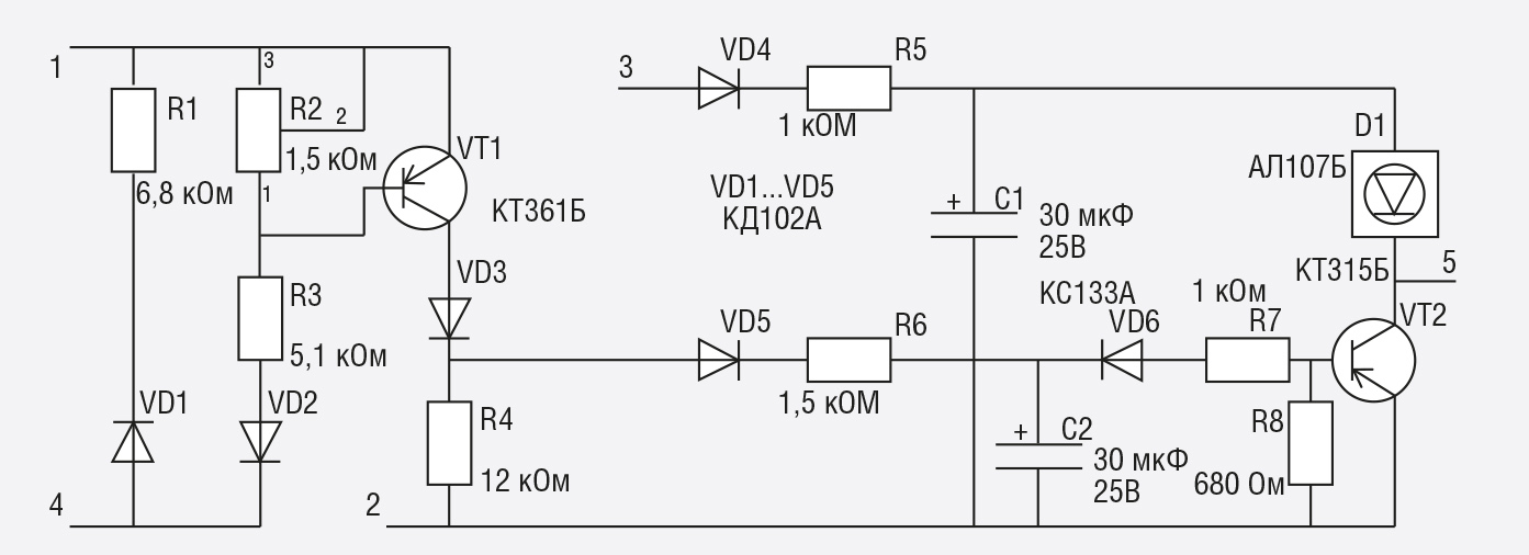 Работа узла контроля датчика уровня осуществляется следующим образом: на измерительные электроды, помещённые в жидкость с требуемой геометрией установки по уровню, подаётся переменное напряжение по двум цепям: VD1, R1 (одна полуволна, исключающая поляризацию водой контактной площади электродов в воде, и VD2, R2, R3 (вторая полуволна для измерения). Контроль проводимости воды осуществляется по этой измерительной полуволне пониженного переменного напряжения, имеющей для безопасности необходимую изоляцию – развязку от сети 220 В. Рабочая точка входного усилителя на VT1 в узле контроля датчика уровня выставляется посредством R2 в зависимости от величины питающего переменного напряжения и проводимости контролируемой жидкости. Диод VD3 защищает VT1 от обратного напряжения. Измерительная полуволна тока проводимости воды усиленная VT1, через VD5 заряжает конденсатор С2 и открывает транзистор VT2, подсвечивая контрольный светодиод D1, и формирует на выводе 5 сигнал низкого уровня. Питание светодиода осуществляется полуволновым выпрямителем на VD4 и C1.