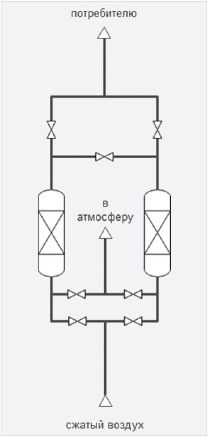 Атмосферный воздух сжимается в компрессоре, проходит систему очистки, состоящей из трёх фильтров и осушителя, накапливается в воздухосборнике и попадает в генератор азота, в котором происходит разделение молекул кислорода и молекул азота методом короткоцикловой безнагревной адсорбции. Молекулы кислорода захватываются адсорбентом, в то время как молекулы азота беспрепятственно проходят адсорбент и поступают потребителю. Генератор азота (рис. 1) состоит из двух ёмкостей, наполненных гранулами углеродного молекулярного сита, системы трубопровода и клапанов.