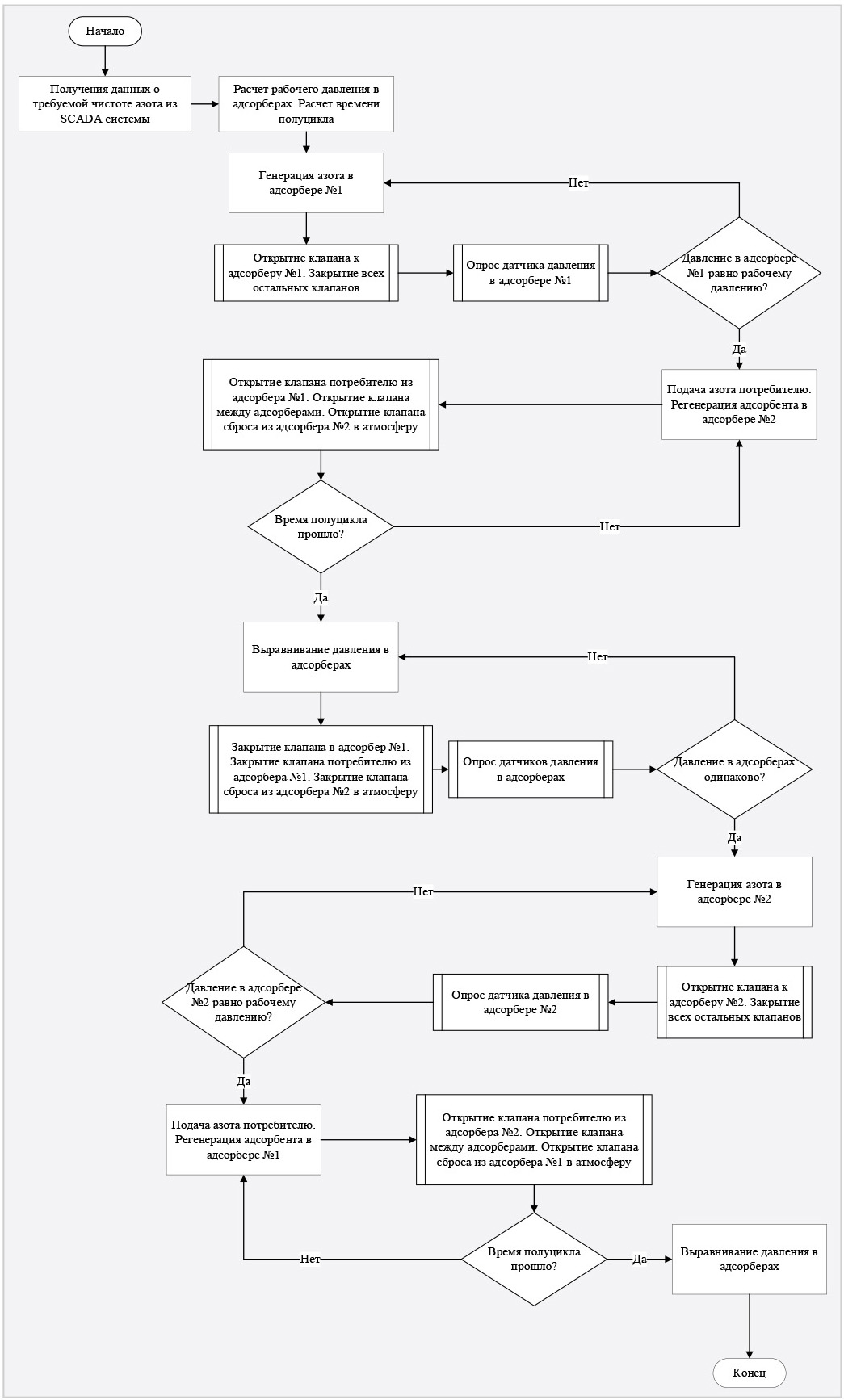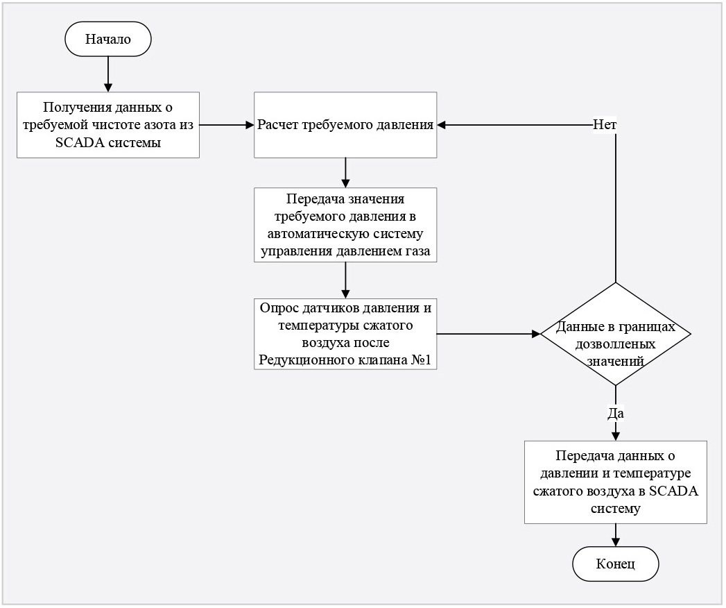Один из программируемых контроллеров используется для контроля и управления генератором азота. Алгоритм управления данного ПЛК представлен на рис. 3.
