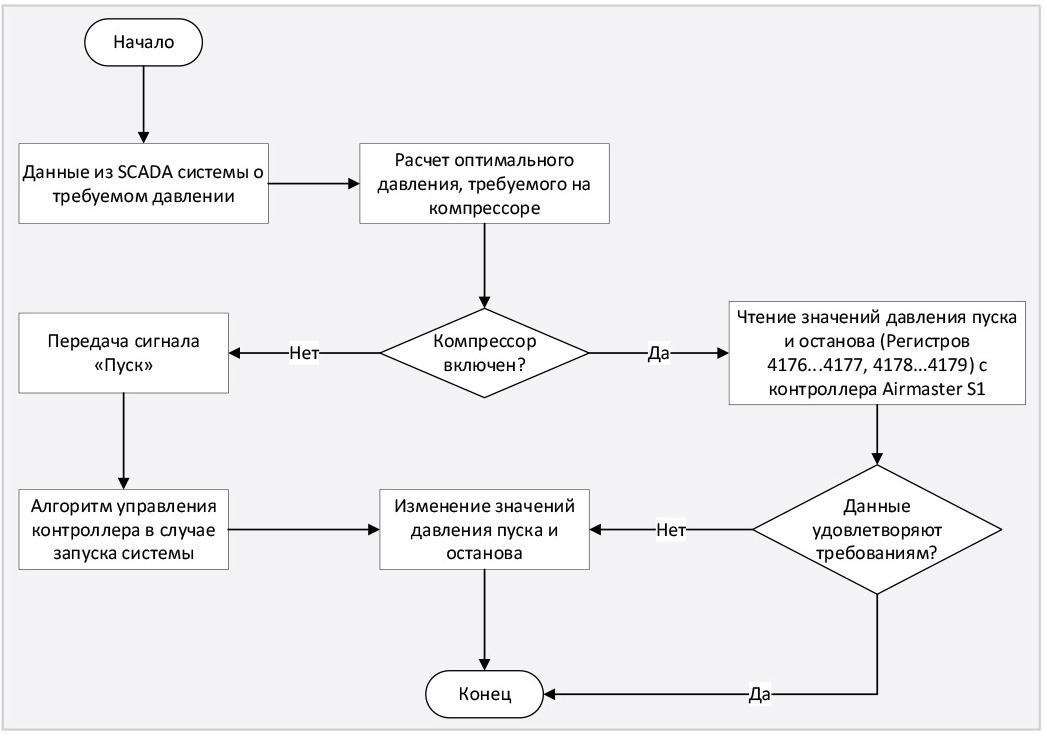 Основная задача по расчёту времени цикла, требуемого давления и температуры сжатого воздуха на входе в генератор азота, взаимодействие с системой визуализации и выполнение роли ведущего контроллера ложится на второй контроллер. Некоторые примеры разработанных алгоритмов управления основного контроллера представлены на рис. 4, 5.
