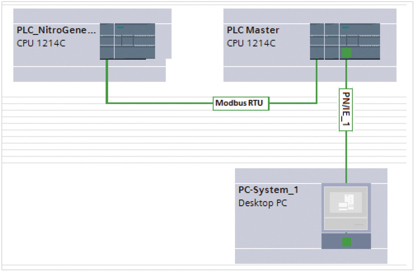Обмен информацей между ПЛК реализован согласно протоколу Modbus RTU, в то время как взаимодействие между основным ПЛК и системой визуализации осуществляется по TCP/IP-протоколу.