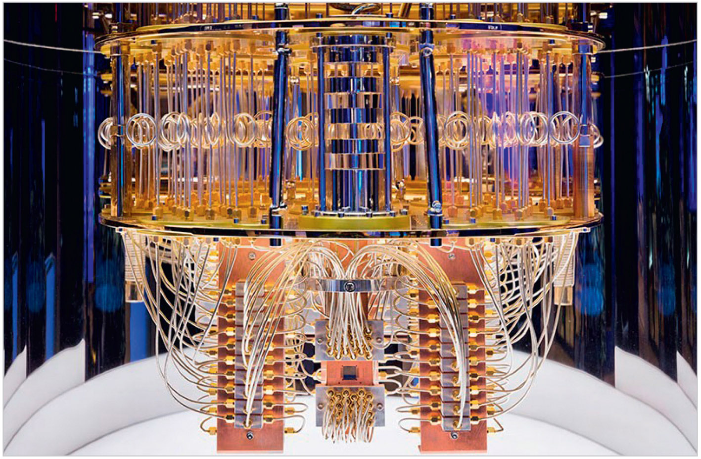 Современные технологии позволяют создавать кубиты на базе самых разных квантовых объектов, таких, например, как ионы, нейтральные атомы, фотоны, дефекты в кристаллах, квантовые эффекты в сверхпроводниках и т.д. Использовать эти квантовые состояния можно только при сверхнизких температурах. Поэтому сами кубиты размещаются в специальной холодильной машине (dilution refrigerator), внутри которой поддерживается температура, близкая к абсолютному нулю. Современный квантовый компьютер – это сооружение достаточно внушительных размеров (рис. 1) [8].