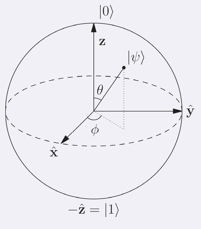 В общем случае кубит можно трактовать как вектор состояния двухуровневой системы в гильбертовом пространстве. Поскольку любой вектор состояния может быть представлен как совокупность элементарных векторов, то кубит вводится как понятие минимально возможного векторного состояния. В качестве наглядного представления кубита обычно используют сферу Блоха (рис. 3) [34, 35].