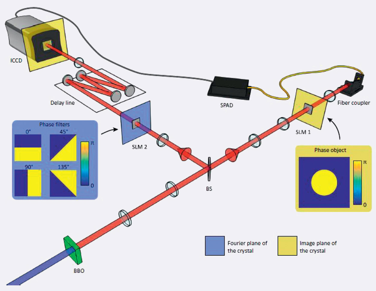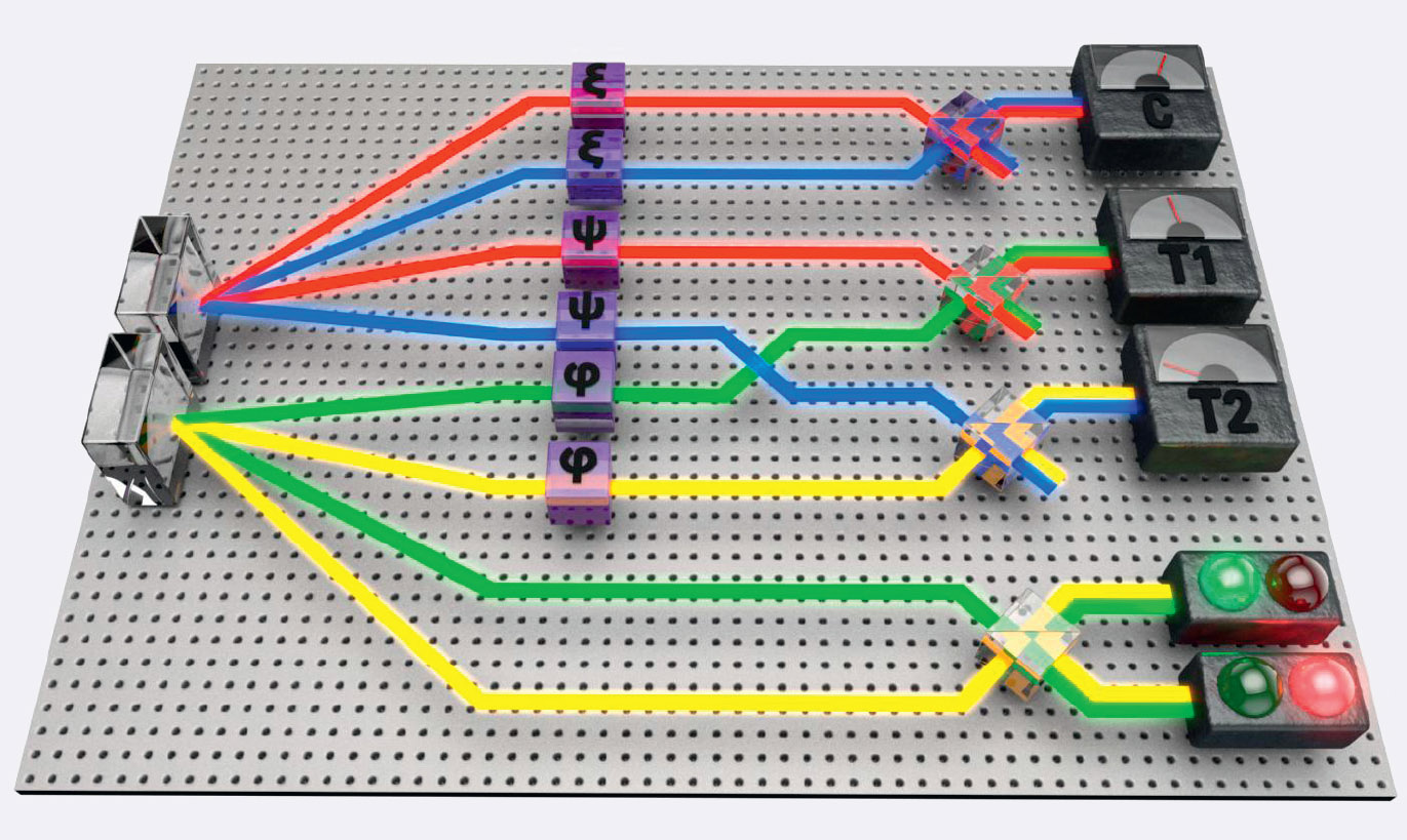 Группа физиков из Университета Глазго разработала установку, в которой поток запутанных фотонов из квантового источника света пропускался через систему специальных фильтров, изменявших фазы вращения (рис. 4). Регистратор отдельных фотонов срабатывал только тогда, когда на него попадали запутанные кванты света. В результате им удалось получить визуальную картину, демонстрирующую эффект запутанности пары фотонов [36].