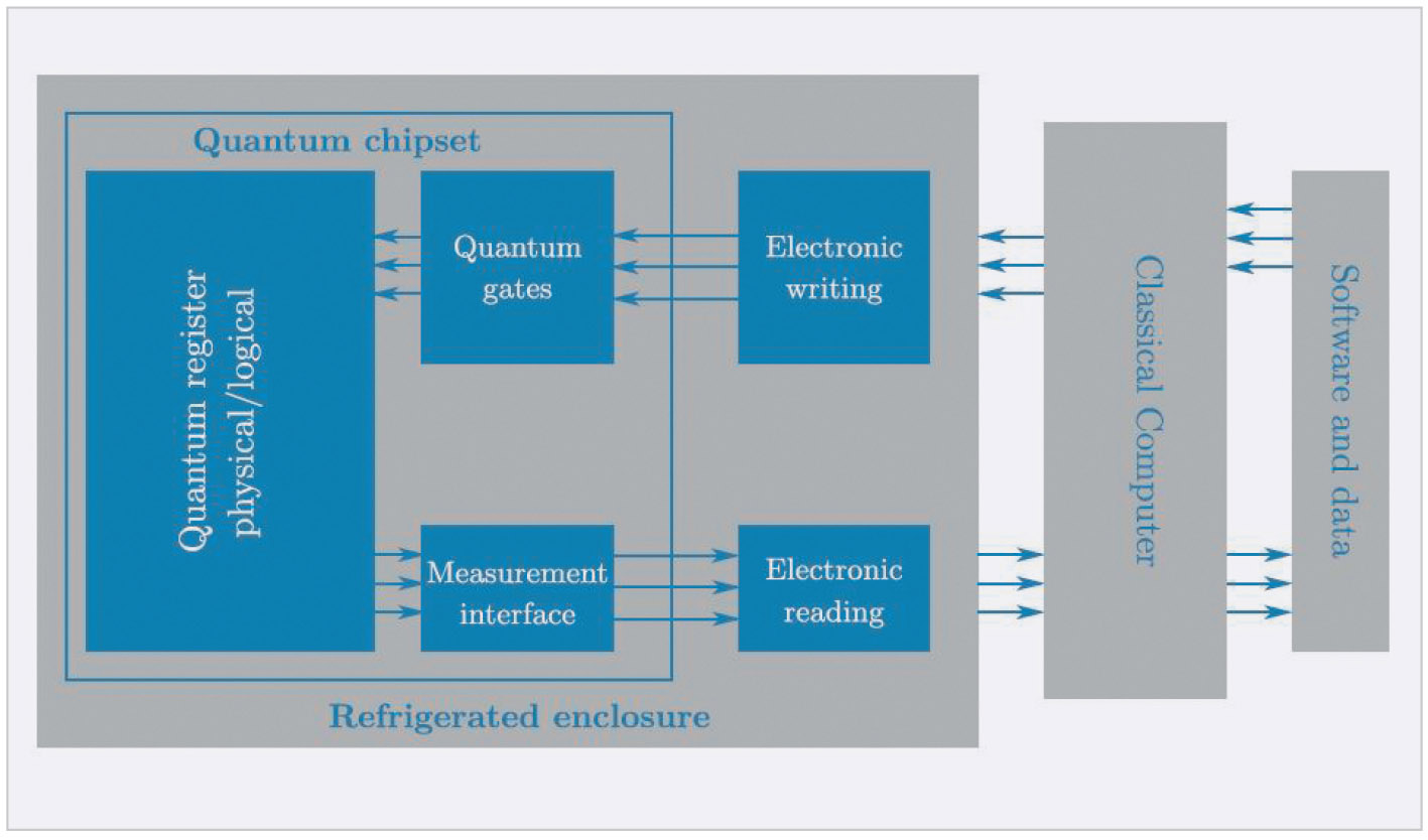Квантовый чипсет небольших размеров содержит: квантовый регистр, состоящий из вычислительных кубитов; квантовые вентили; интерфейс для снятия показаний состояния кубитов. Управляется квантовый чипсет внешней стандартной электроникой.