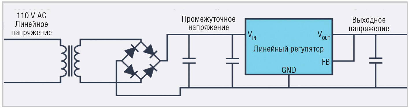 В течение многих лет типичный преобразователь мощности состоял из трансформатора на 50 или 60 Гц, подключённого к электросети, с определённым соотношением обмоток для создания нерегулируемого выходного напряжения – на несколько вольт выше, чем необходимое напряжение питания в системе. Затем с помощью линейного регулятора это напряжение преобразовывалось в хорошо отрегулированное по мере необходимости для электроники. На рис. 2 показана блок-схема этой концепции.