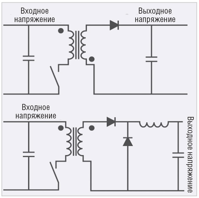Этот преобразователь прост в изготовлении, но требует относительно больших трансформаторов для хранения всей энергии, необходимой для правильной работы. Такая особенность ограничивает топологию более низкими уровнями мощности. На рис. 6 вверху показан обратноходовой преобразователь, а внизу – прямой преобразователь.
