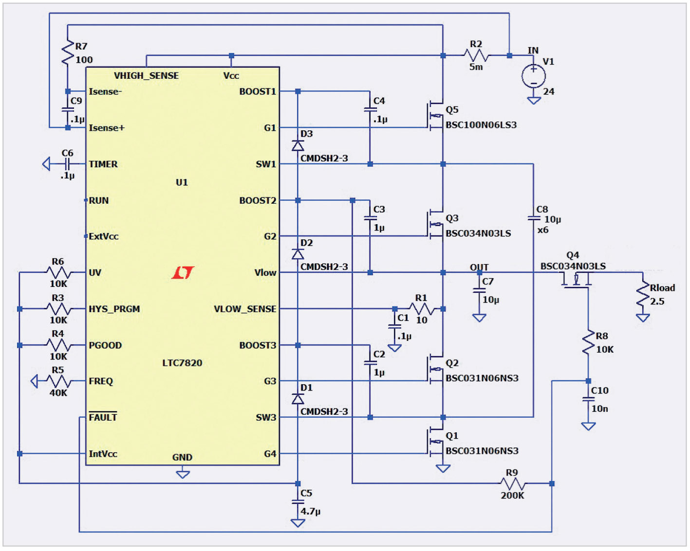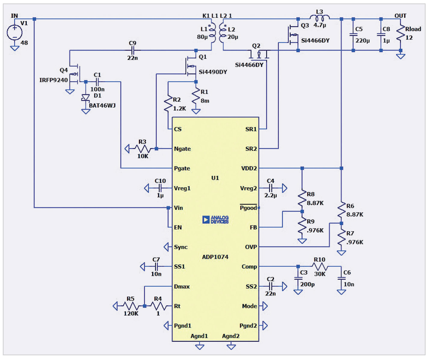 На рис. 7 показана схема среды моделирования LTspice конструкции прямого активного зажима с использованием ADP1074.