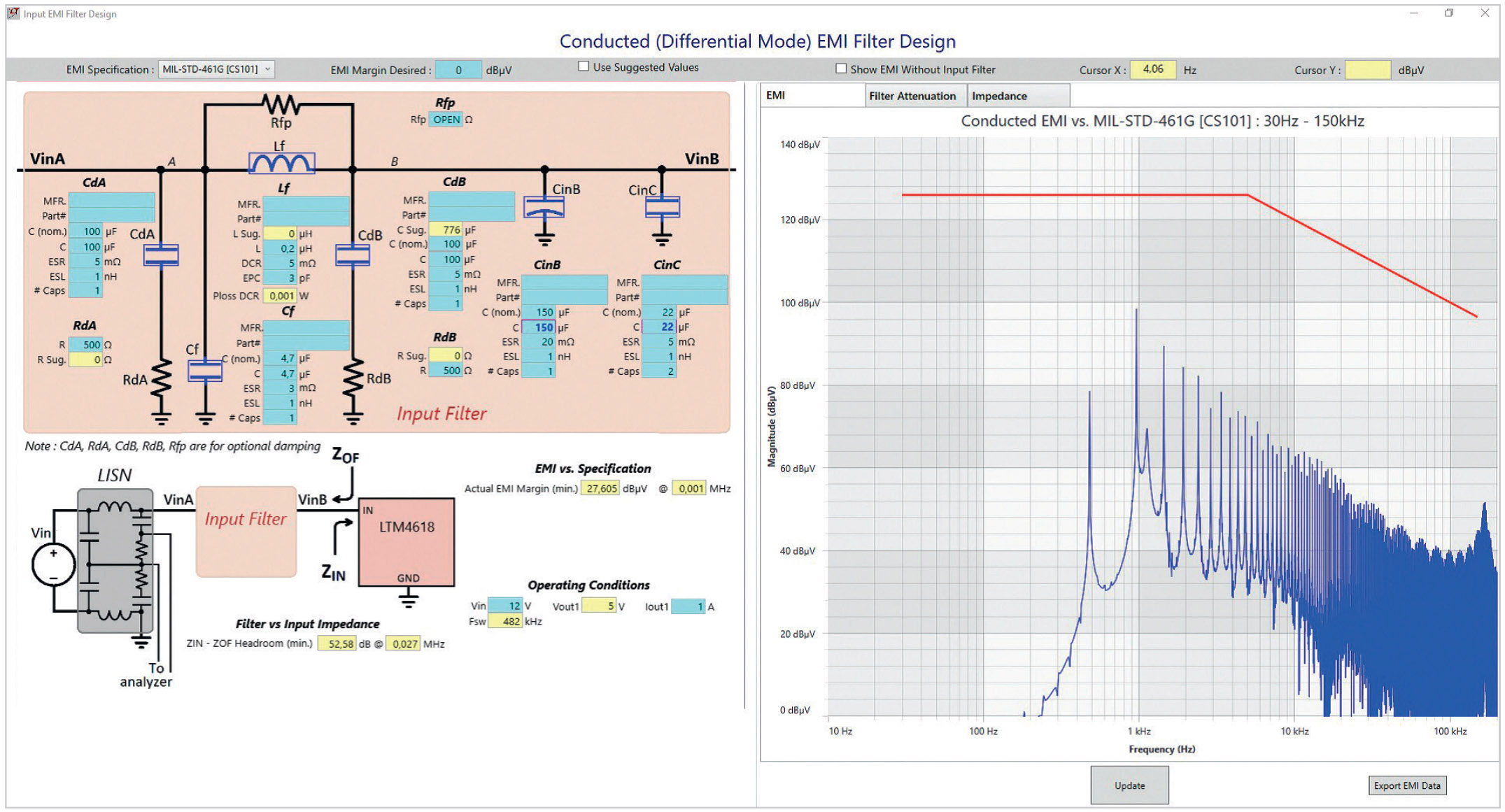 Наконец, фильтры имеют определённый импеданс. Этот импеданс взаимодействует с сопротивлениями силовых преобразователей, подключённых к фильтру. Такое взаимодействие может привести к нестабильности и колебаниям. Инструменты моделирования, такие как LTspice и LTpowerCAD от Analog Devices, могут помочь ответить на все эти вопросы и помочь с разработкой идеального фильтра. На рис. 10 показан графический пользовательский интерфейс конструктора фильтров в среде проектирования LTpowerCAD. С помощью этого инструмента проектирование фильтров может быть значительно упрощено.