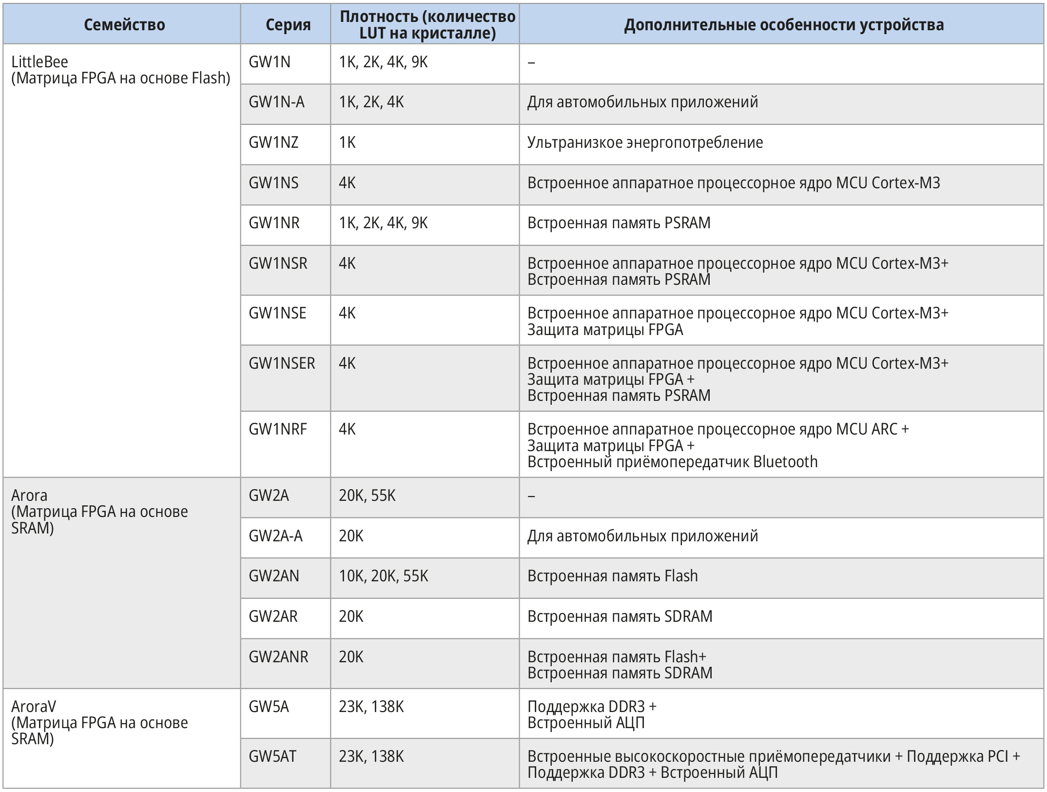 В настоящее время вся продукция ПЛИС от GOWIN представлена тремя семействами: LittleBee, Arora и Arora V. Каждое из семейств включает несколько серий ПЛИС, как показано в табл. 1.