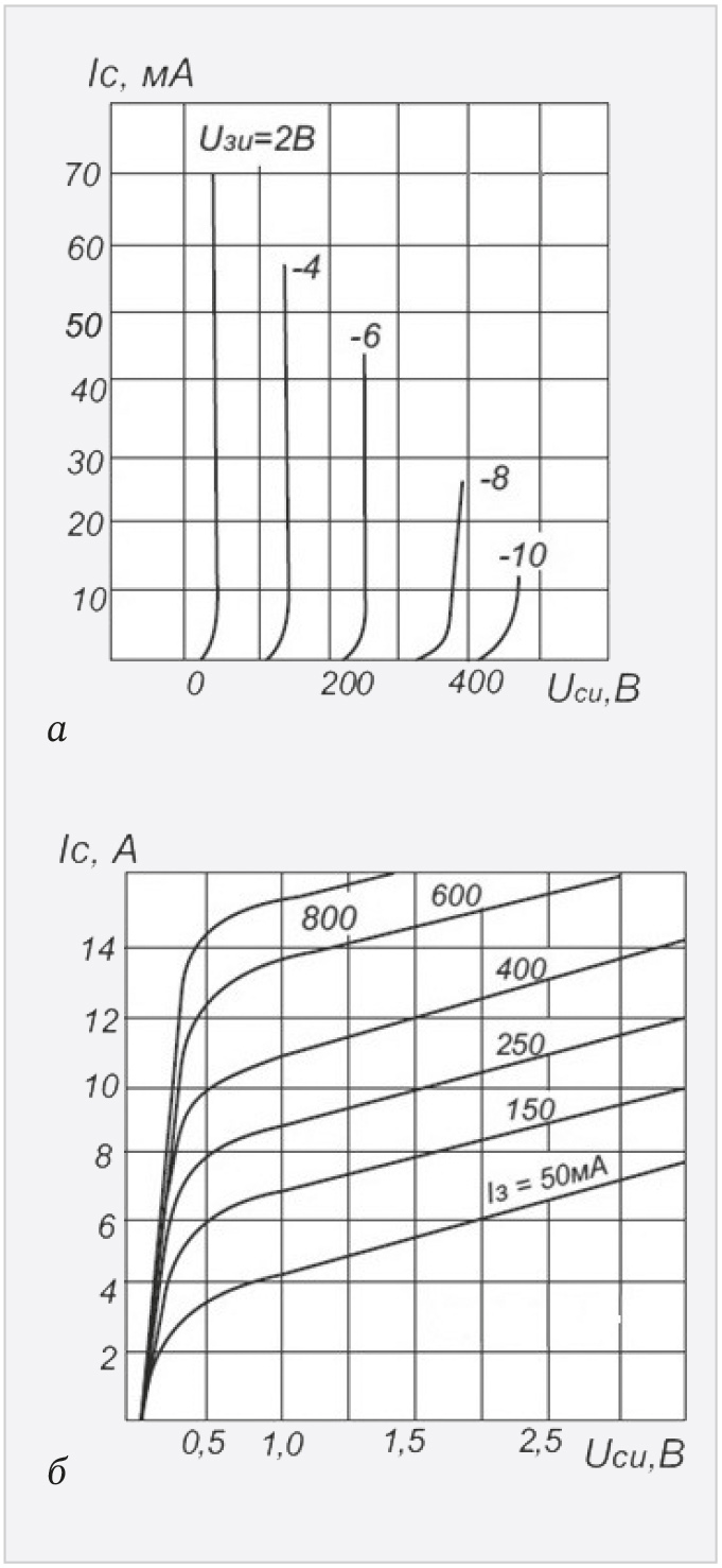 На рис. 2 приведены выходные вольтамперные характеристики для двух режимов работы: полевого и биполярного.