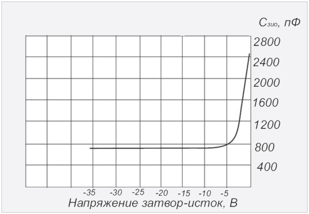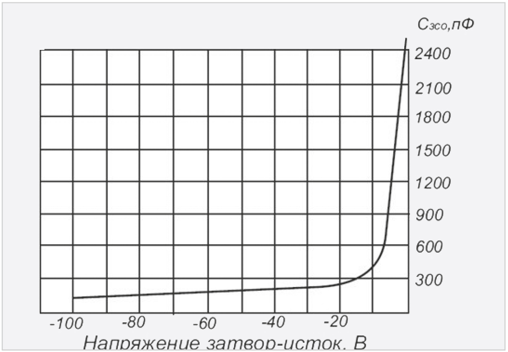 На рис. 3 представлена зависимость Rси отк от тока затвора при различных значениях тока стока, на рис. 4 – зависимость Rси отк от температуры на корпусе, а на рис. 5 и 6 – соответственно зависимость ёмкостей затвор-исток и затвор-сток от прикладываемых напряжений [2].