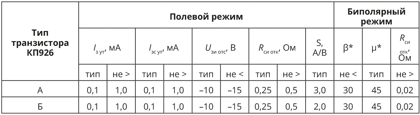 Условные обозначения: Iз ут – ток утечки затвор-исток; Iзс ут – ток утечки затвор-сток; Uзи отс – напряжение отсечки; Rси отк – сопротивление в открытом состоянии; S – крутизна характеристики; β* – коэффициент усиления по току; μ* – коэффициент усиления по напряжению.