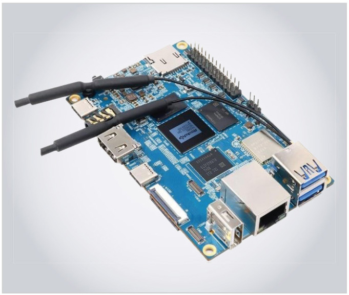 Заслуживает профессионального внимания одноплатная система с процессором Rockchip RK3588S, поддержкой до 32 Гбайт ОЗУ, несколькими портами и разъёмами разного форм-фактора и назначения. Устройство является усовершенствованной версией модели Orange Pi 5B, выпущенной в 2022 году. Но с новацией: появилась встроенная поддержка Wi-Fi 6 с модулем AR827EP и Bluetooth 5.0, а также модуль eMMC с объёмом памяти от 32 Гбайт до 256 Гбайт. Это делает её пригодной для применения в роутерах и системах БЛВСС. Внешний вид устройства представлен на рис. 5.