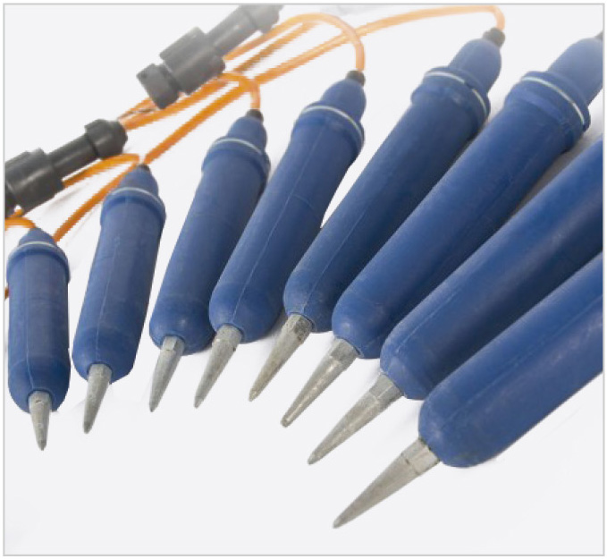 Мобильный (переносной) комплект для производства сейсморазведочных работ состоит из регистратора, цифровых геофонов, соединяемых магистральным кабелем в линию приёма и специализированного пакета программного обеспечения для регистрации и анализа данных. Комплект датчиков выглядит так, как представлено на рис. 15.