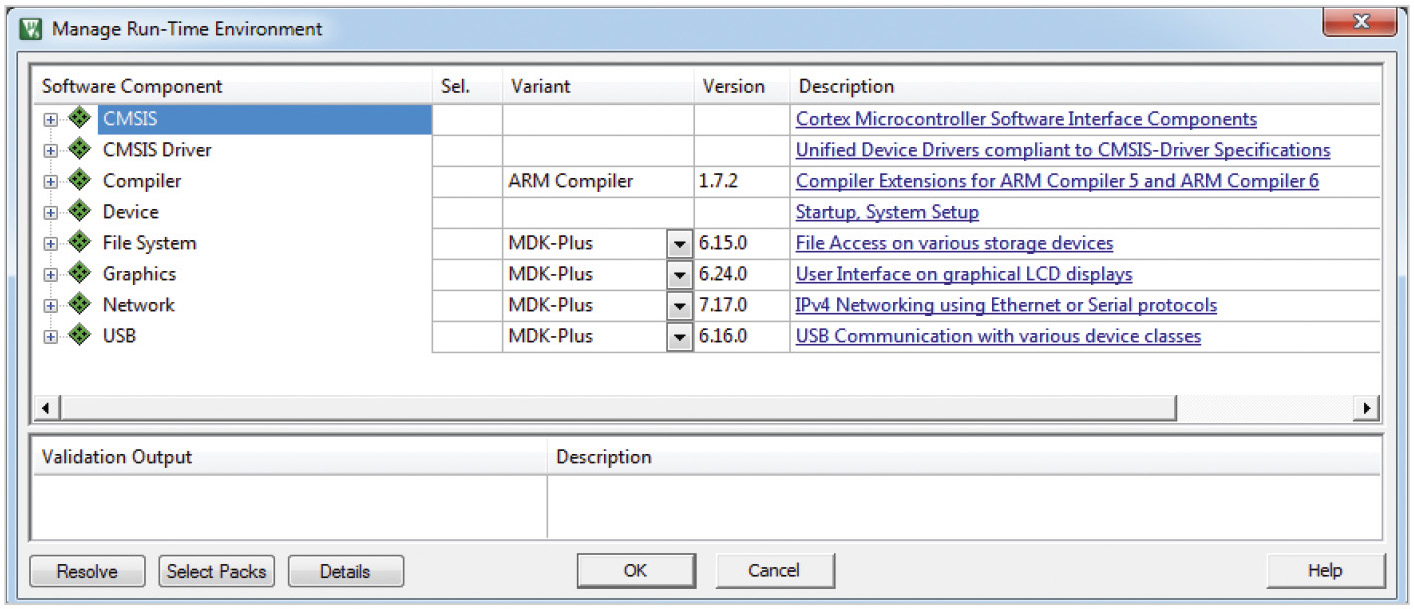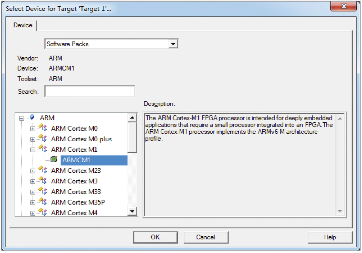 Далее запускаем IDE ARM Keil MDK (автор использовал бесплатную версию v 5.37.0.0 с ограниченным размером встраиваемого кода) и создаём в нём новый проект. Для этого в главном меню выбираем: Project > New mVision Project. В открывшемся окне задаём имя файла проекта – FPGA_project_keil_soft.uvprojx и его расположение – подкаталог PROJECT в каталоге FPGA_project_keil_soft. Далее в автоматически открывшемся окне выбираем платформу целевой системы проекта, как показано на рис. 1: ARM Cortex M1 > ARMCM1. Далее автоматически открывается окно «Manage Run-Time Environment» (рис. 2), оставляем все его настройки заданными по умолчанию, кликаем на кнопке «OK». Проект создан.