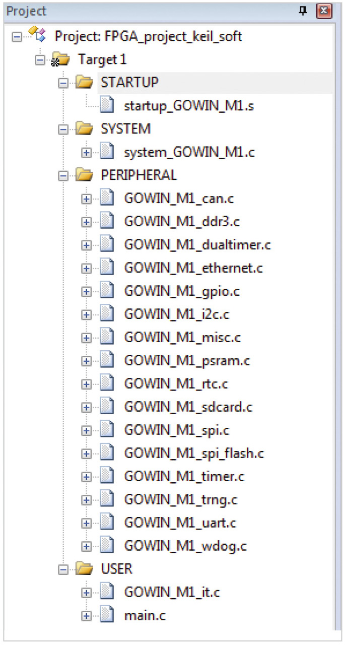 Для образца при формировании структуры проекта в IDE ARM Keil MDK рекомендуется взять модель Keil_RefDesign из архива «сервис пак» Gowin_EMPU_M1_Vx.x.x.zip, который можно загрузить с сайта GOWIN. Согласно рекомендуемой там структуре корневой каталог проекта должен содержать следующие подкаталоги: